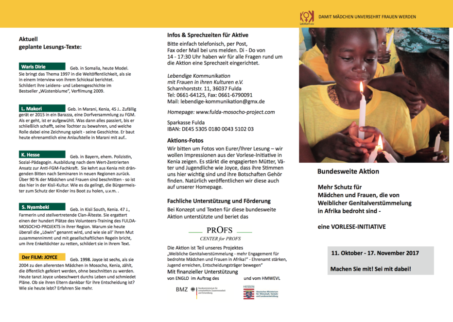 LebKom is starting a nationwide campaign entitled 'More protection for girls and women endangered by female genital mutilation in Africa'. There will be readings all over Germany from 'Desert Flower (FGM) is not inevitable – the Kisii, KNOWLEDGE and CHANGE'.
