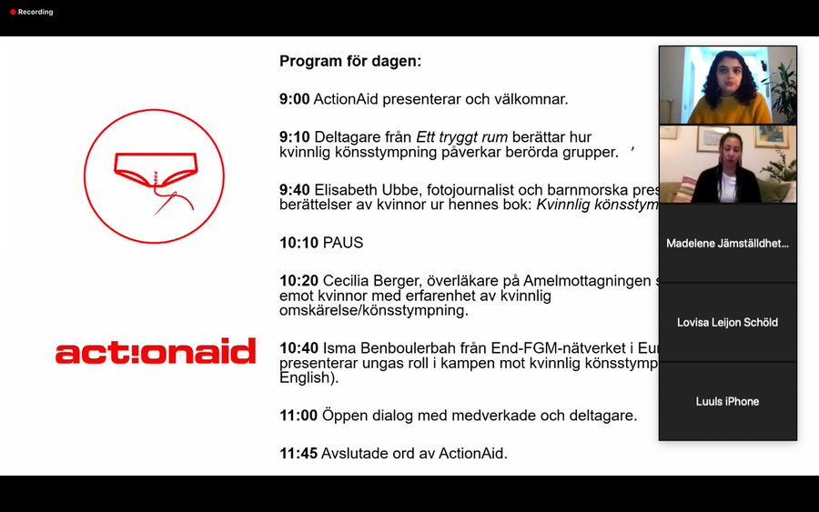 Moreover, on 26 November, ActionAid Sweden asked End FGM EU to present The Purple Chair during their Digital Dialogue about their work on FGM and how it has been affected by COVID-19. Isma Benboulerbah talked about young people's role in the fight against FGM and about The Purple Chair Series.