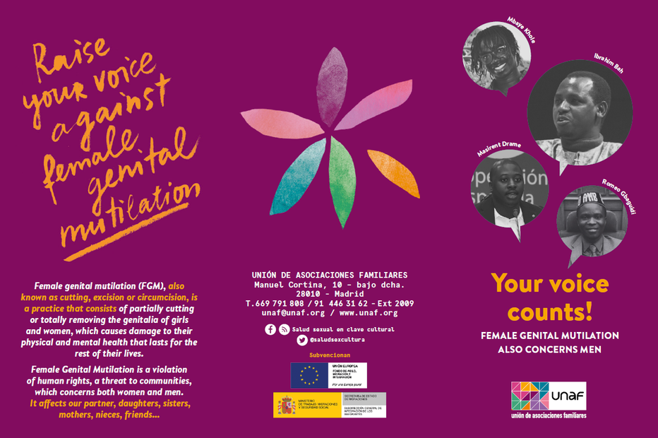 With the collaboration of men like Ibrahim, UNAF is strengthening its awareness-raising work on FGM prevention addressed to men. To support Ibrahim Bah’s fight, we have published a specific brochure aimed at male audience with the slogan “Your voice counts! Female Genital Mutilation also concerns men”, for which we have counted with the collaboration of Ibrahim Bah, and other focal points such as Romeo Gbaguidi, Masirent Drame and Mbaye Khole (edited in Spanish, French and English).