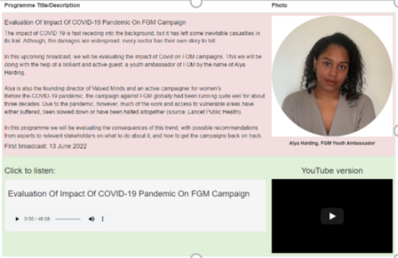 Ayla also did an interview on the Evaluation of Impact of Covid-19 Pandemic on FGM Campaign for Radio Naija: The Pan-African Media for Informing, Educating and Empowering Migrants in Diaspora. In this programme she evaluates the consequences of this trend, with possible recommendations from experts to relevant stakeholders on what to do about it, and how to get the campaigns back on track.