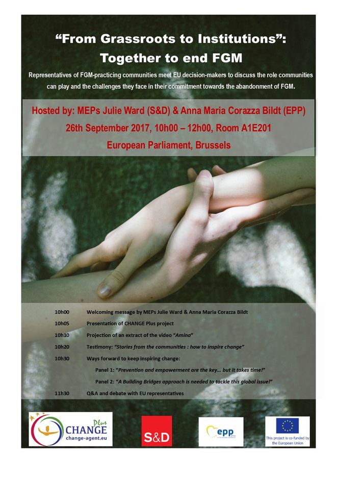 The meeting will be hosted by MEPs Julie Ward (S&D) & Anna Maria Corazza Bildt (EPP).The event will be crucial for EU decision and policy-makers in Brussels to listen to community representatives from the grassroots level within EU member states, with the aim to elaborate common flexible and innovative solutions to achieve the common goal of putting an end to the practice of FGM in Europe and beyond.